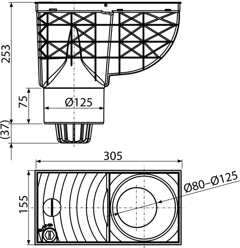 - ტრაპის კორპუსი კანალიზაციასთან გადინების პირდაპირი კავშირით Ø125 მმ