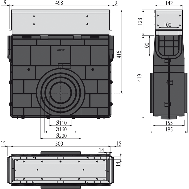 სადრენაჟე არხის ქვიშის ხაფანგი განკუთვნილი ასიმეტრული დაქანებისთვის 100 მმ, უჟანგავი ფოლადი