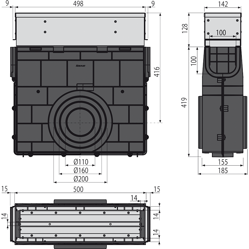 სადრენაჟე არხის ქვიშის ხაფანგი განკუთვნილი ასიმეტრული დაქანებისთვის 100 მმ, უჟანგავი ფოლადი