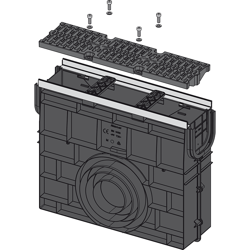 • კომპოზიტური ბადე - ფიქსირდება არხის სხეულში, უჟანგავი ფოლადის ოთხი ჭანჭიკის დახმარებით, სანიაღვრე ღარების სიგანე 14 მმ