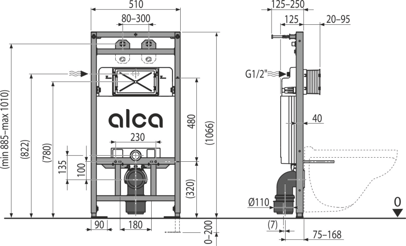 - სამონტაჟო სიღრმე 125 მმ, გადინების მუხლით 160 მმ