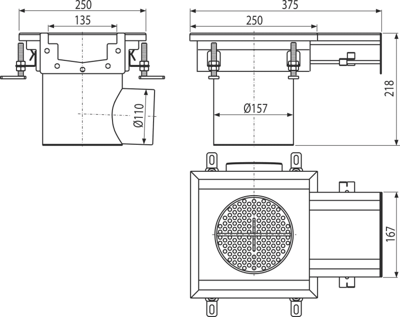 სამრეწველო იატაკის ტრაპი ოთხკუთხედი სადინარით 250×250-135, უჟანგავი ფოლადი AISI 316L