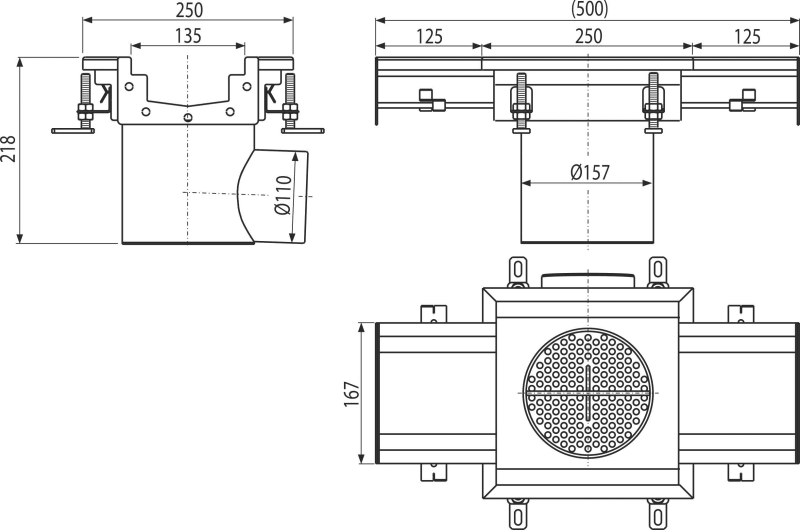 სამრეწველო იატაკის ტრაპი ოთხკუთხედი სადინარით 250×250-135, უჟანგავი ფოლადი AISI 304