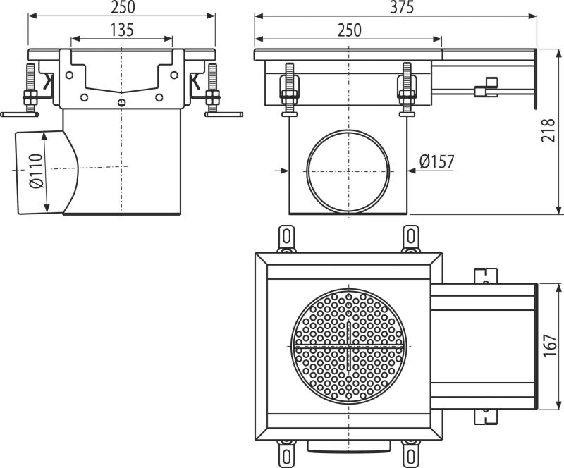 სამრეწველო იატაკის ტრაპი ოთხკუთხედი სადინარით 250×250-135, უჟანგავი ფოლადი AISI 304