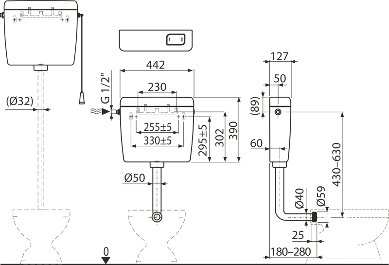 • მუხლი Ø50 / 40 მმ დაბალ სიმაღლეზე განთავსებული ავზისთვის