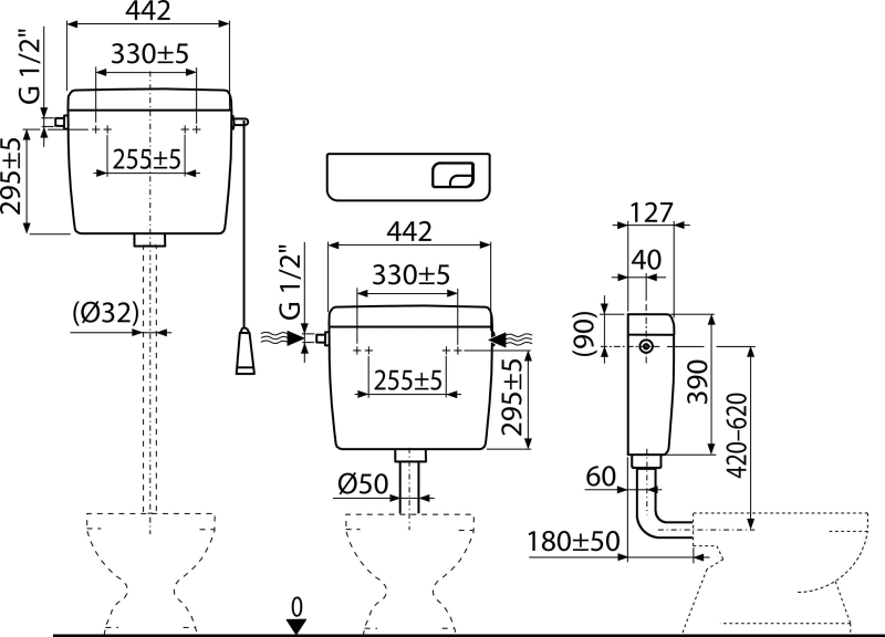 - ჩარეცხვის ღილაკი, დაბალ სიმაღლეზე განლაგებული ავზისთვის (პატარა და დიდი ღილაკი)