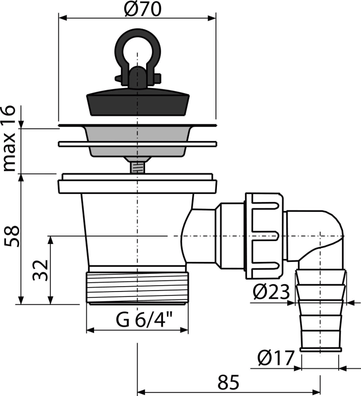 ნიჟარის სიფონის ჩამკეტი 6/4" უჟანგავი ფოლადის ბადით DN70 და სხვა მოწყობილობასთან დამაკავშირებლით
