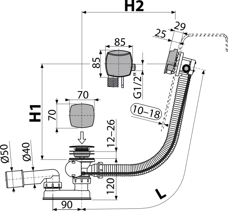 - აბაზანის შევსების ფუნქციით დაგინება-გადადინების სისტემა