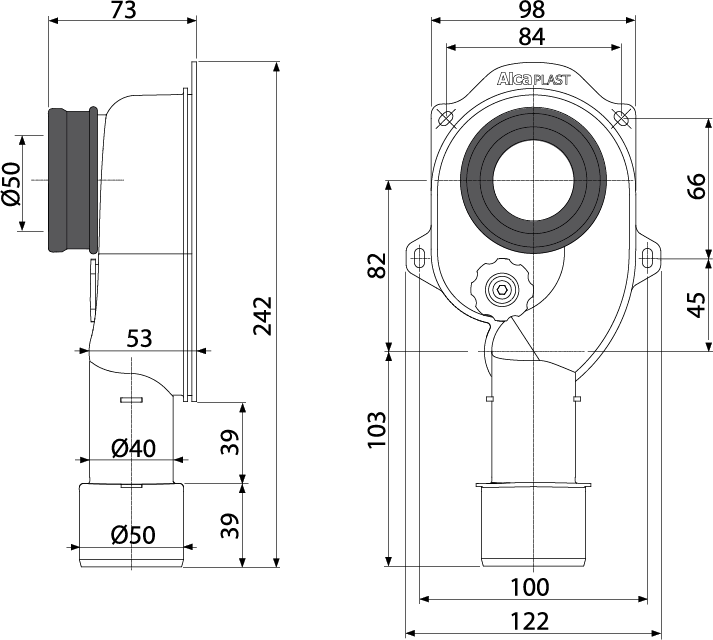 - კავშირი გადინების მილთან Ø40/50 მმ